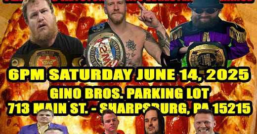 Keystone State Wrestling Alliance (KSWA) will present Pizza, Pints & Piledrivers 4 on Saturday, June 14, 2025, at the Gino Bros. Parking Lot, located at 713 Main Street, Sharpsburg, Pennsylvania. Doors open at 5:00 p.m. and bell time is scheduled for 6:00 p.m. For ticket information, call 412-781-4466 or 412-726-1762.