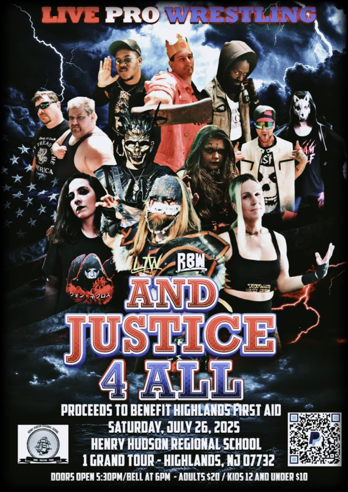 Locked Target Wrestling presents And Justice 4 All on Saturday, July 26, 2025, at Henry Hudson Regional School (1 Grand Tour, Highlands, NJ 07732). Doors open at 5:30 p.m. and bell time is set for 6 p.m. Tickets are available at the door, with proceeds benefiting Highlands First Aid.