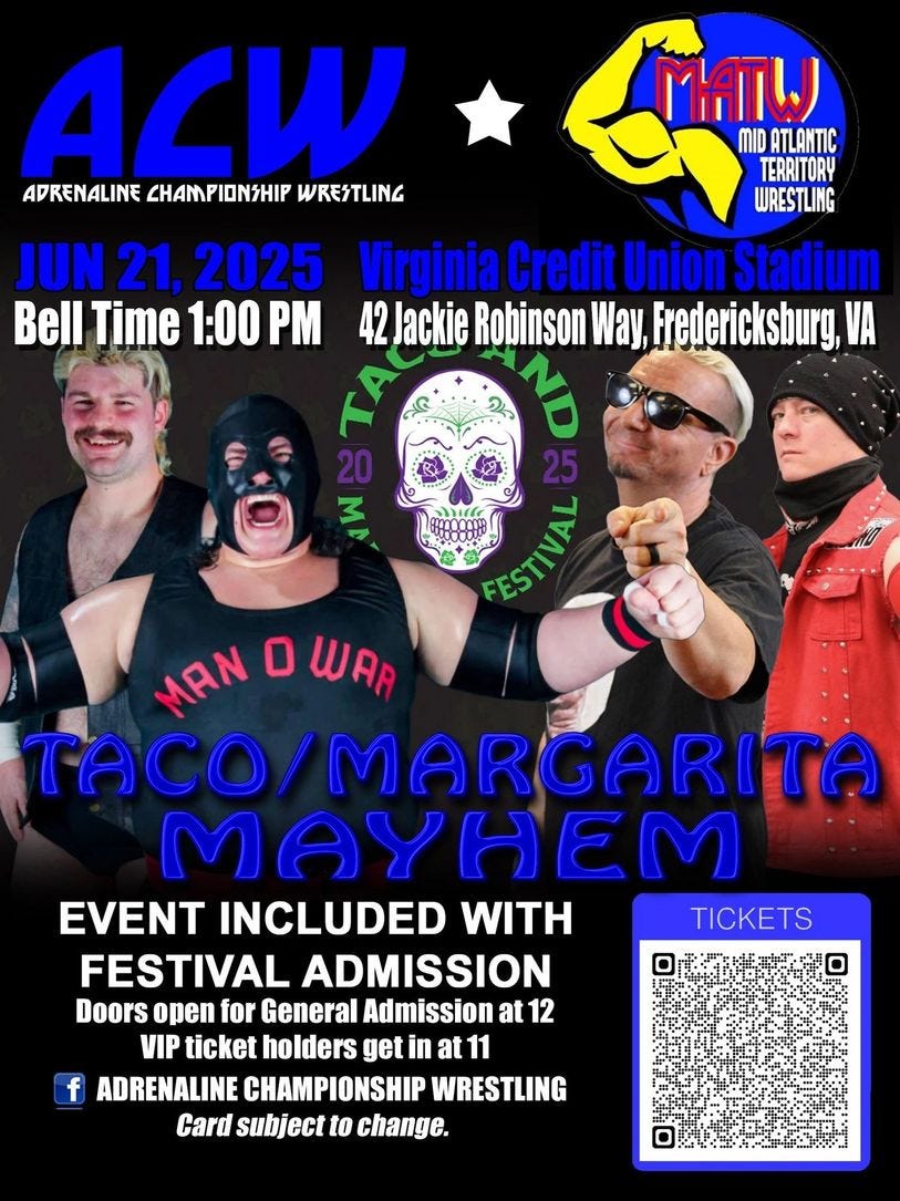 There will be live wrestling from Adrenaline Championship Wrestling (ACW) and Mid Atlantic Territory Wrestling (MATW) at Taco/Margarita Mayhem on Saturday, June 21, 2025, at Virginia Credit Union Stadium, 42 Jackie Robinson Way, Fredericksburg, VA. VIP ticket holders may enter at 11:00 AM, doors open for general admission at 12:00 PM, and bell time is 1:00 PM. Tickets are included with admission to the Taco and Margarita Festival.