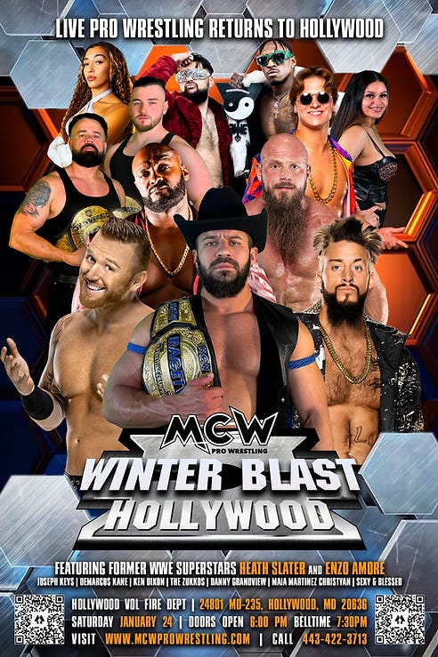 MCW Pro Wrestling presents Winter Blast on Saturday, January 24, 2026, at the Hollywood Volunteer Fire Department in Hollywood, Maryland. The bell time is 7:30 p.m. Tickets are available online.