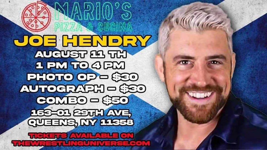 This Sunday, August 11, you can meet viral sensation and TNA/NXT star Joe Hendry from 1-4 p.m. at Mario’s Pizza & Cucina at 163-01 29th Avenue in Queens, NY. Tickets are available online.