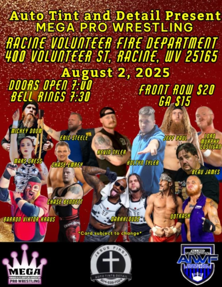 MEGA Pro Wrestling returns to action in Racine, West Virginia, on Saturday, August 2, 2025, with a live event at the Racine Volunteer Fire Department (400 Volunteer St, Racine, WV 25165). Doors open at 7:00 p.m. and bell time is scheduled for 7:30 p.m. Tickets are available at the door.