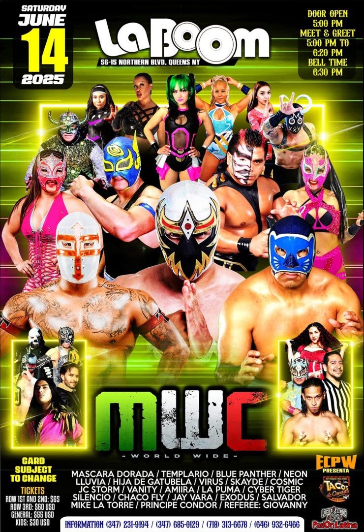 ECPW will present MWC World Wide on Saturday, June 14, 2025, at La Boom, located at 56-15 Northern Blvd, Queens, New York. Doors open at 5:00 p.m., with a meet and greet scheduled from 5:00 to 6:20 p.m. Bell time is set for 6:30 p.m. Tickets are available at the door.