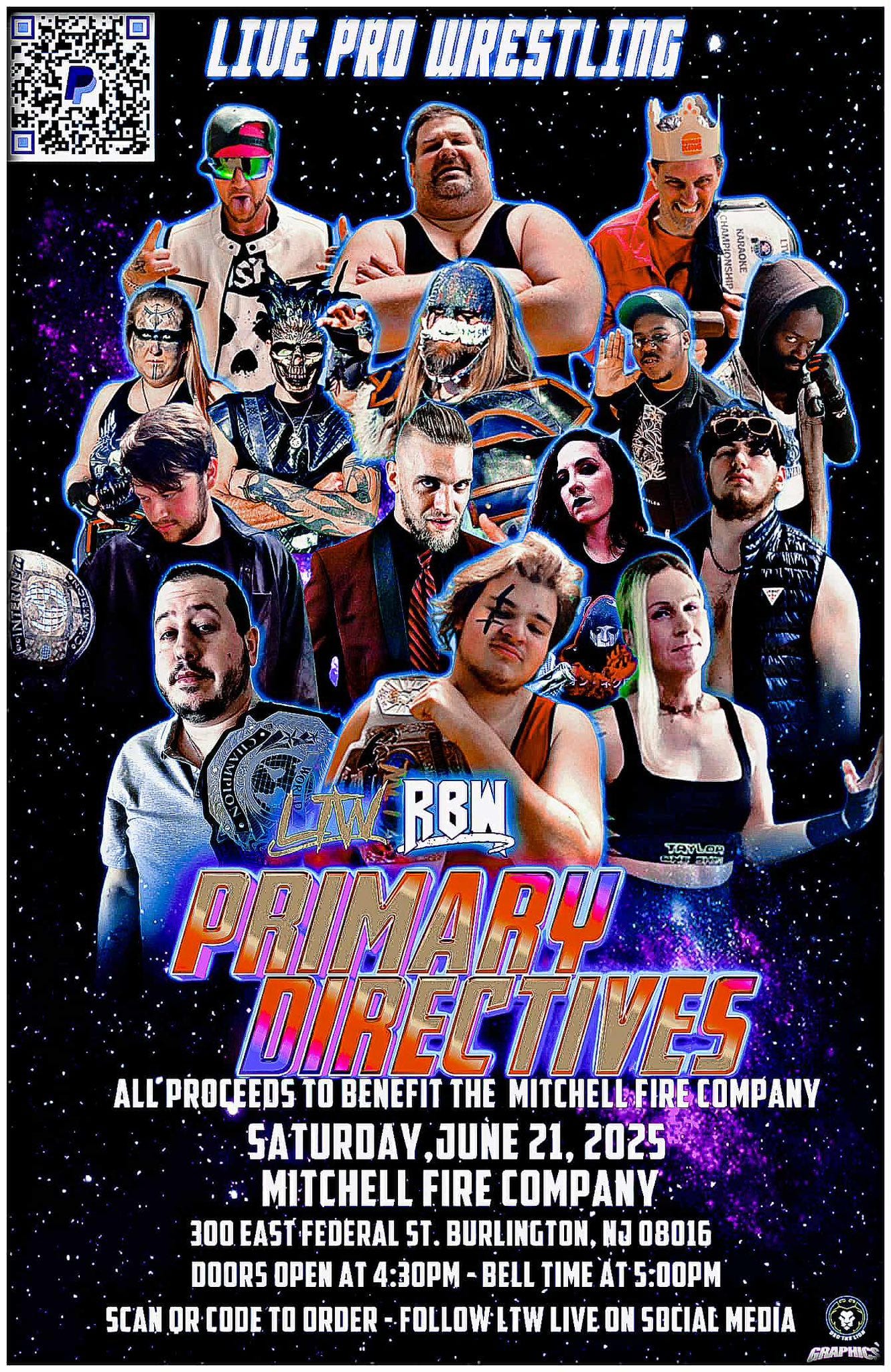 LTW and RBW present Primary Directives on Saturday, June 21, 2025, at the Mitchell Fire Company, 300 East Federal Street, Burlington, NJ 08016. Doors open at 4:30 p.m. and bell time is 5:00 p.m.
