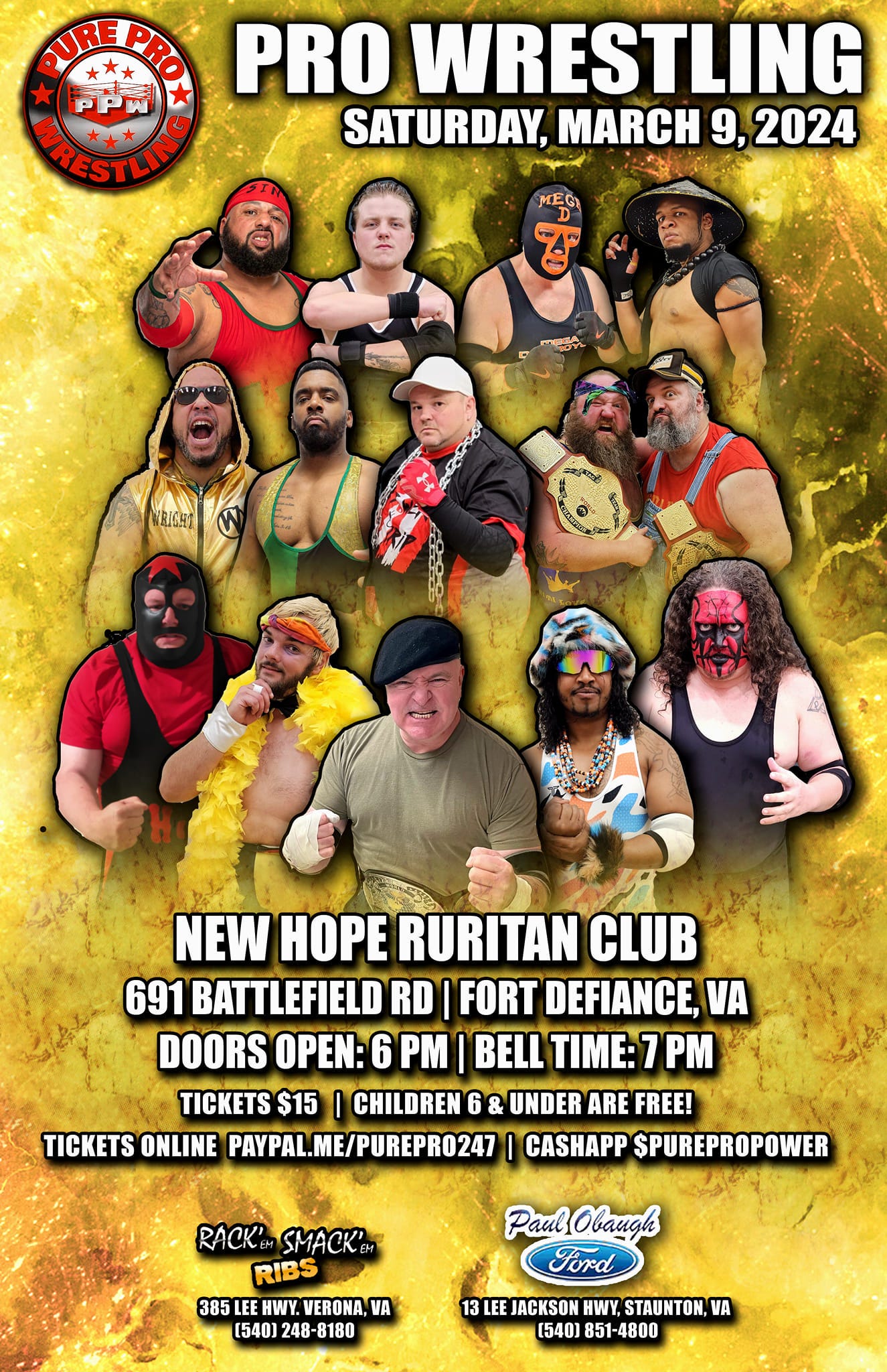 This Saturday night, Pure Pro Wrestling is making a comeback at the New Hope Ruritan Club in Fort Defiance, VA. The bell time is 7 pm, and doors open at 6 pm. Tickets are priced at just $15, and children aged 6 and under get in for free.