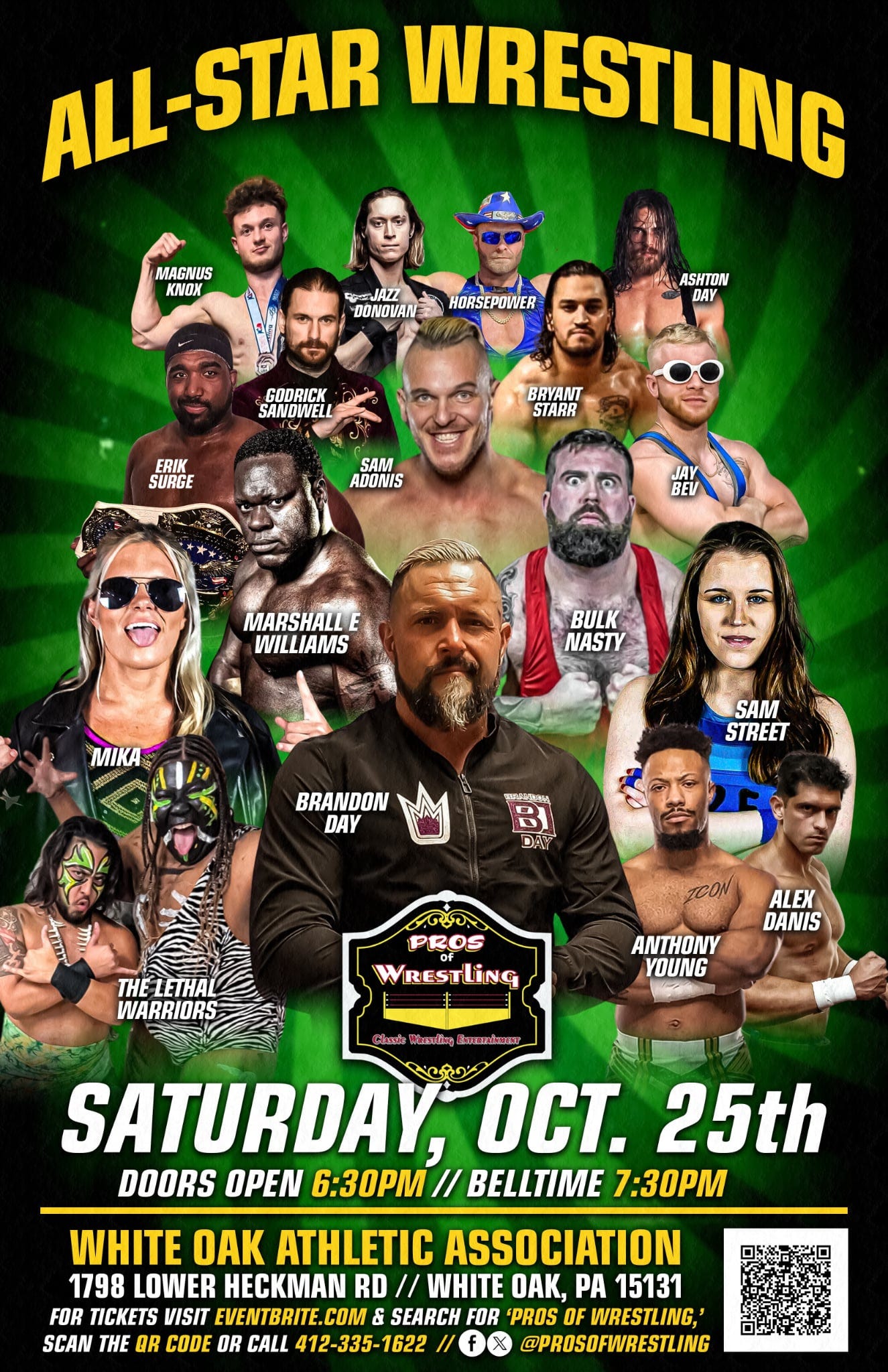 Pros of Wrestling presents All-Star Wrestling on Saturday, October 25, 2025, at the White Oak Athletic Association, 1798 Lower Heckman Road in White Oak, Pennsylvania. Doors open at 6:30 p.m., and bell time is 7:30 p.m. Tickets are available online.