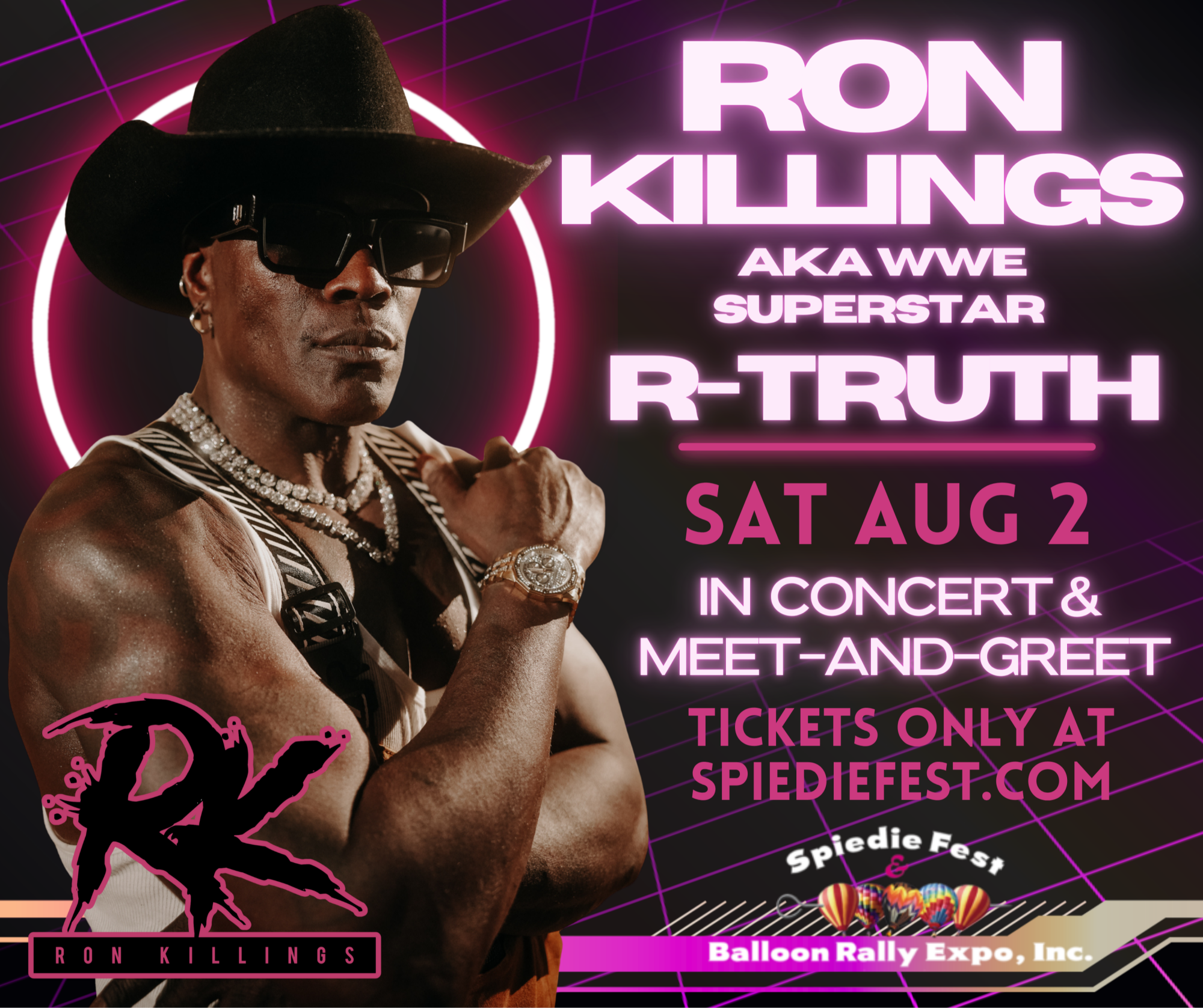 Spiedie Fest & Balloon Rally Expo will host Ron Killings, also known as WWE Superstar R-Truth, on Saturday, August 2, 2025, at Otsiningo Park (1 Otsiningo Park, Binghamton, NY 13905). The meet-and-greet will take place from 2:00 p.m. to 4:00 p.m., and his live music performance is scheduled for 6:00 p.m. Tickets are available at spiediefest.com.