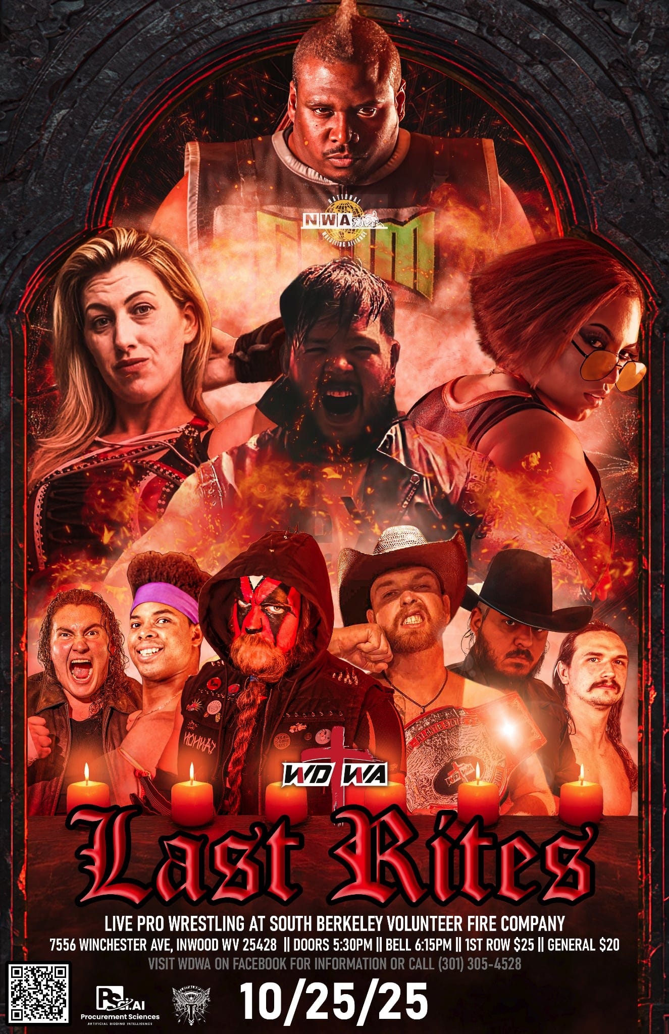 World Domination Wrestling Alliance (WDWA) presents Last Rites on Saturday, October 25, 2025, at South Berkeley Volunteer Fire Company, 7556 Winchester Avenue in Inwood, West Virginia. Doors open at 5:30 p.m., and the bell time is 6:15 p.m. For ticket information, call (301) 305-4528.