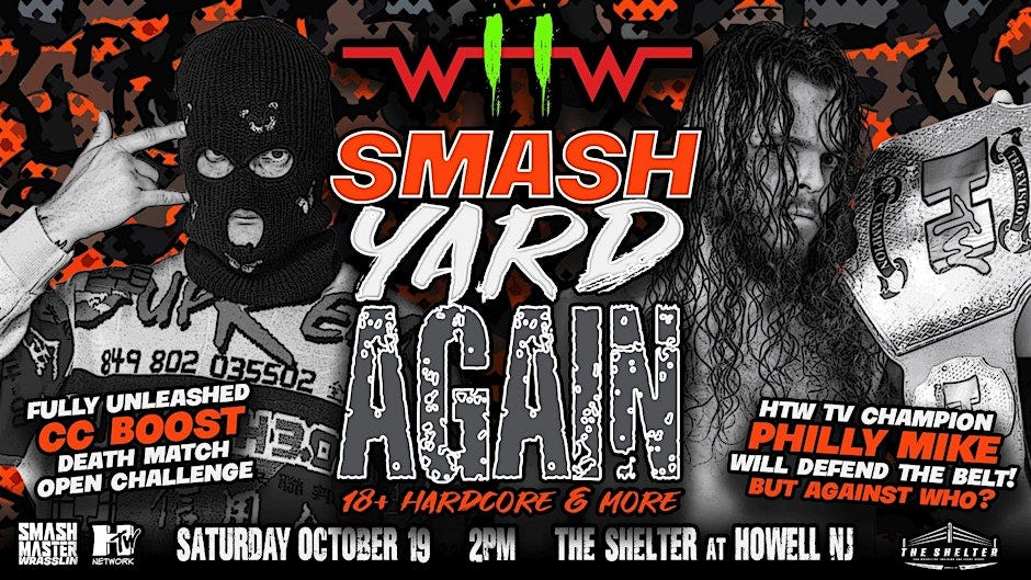 Smash Master Wrasslin' presents Smash Yard Again on Saturday, October 19, at 2 PM at The Shelter in Howell, NJ. This event is for ages 18 and up, with 21+ to drink, and it's BYOB. Tickets are available online.
