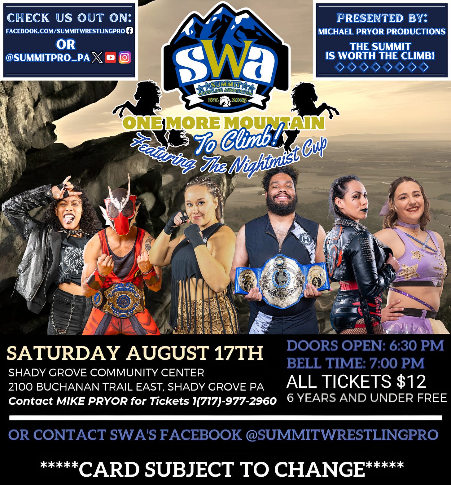 Summit Wrestling Association presents *One More Mountain to Climb* at the Shady Grove PA Ruritan, located at 2100 Buchanan Trail East, Shady Grove, PA, on Saturday, August 17th. Doors will open at 6:30 PM, with bell time at 7:00 PM. To reserve your tickets, call Mike Pryor at 717-977-2960 or contact them on Facebook.