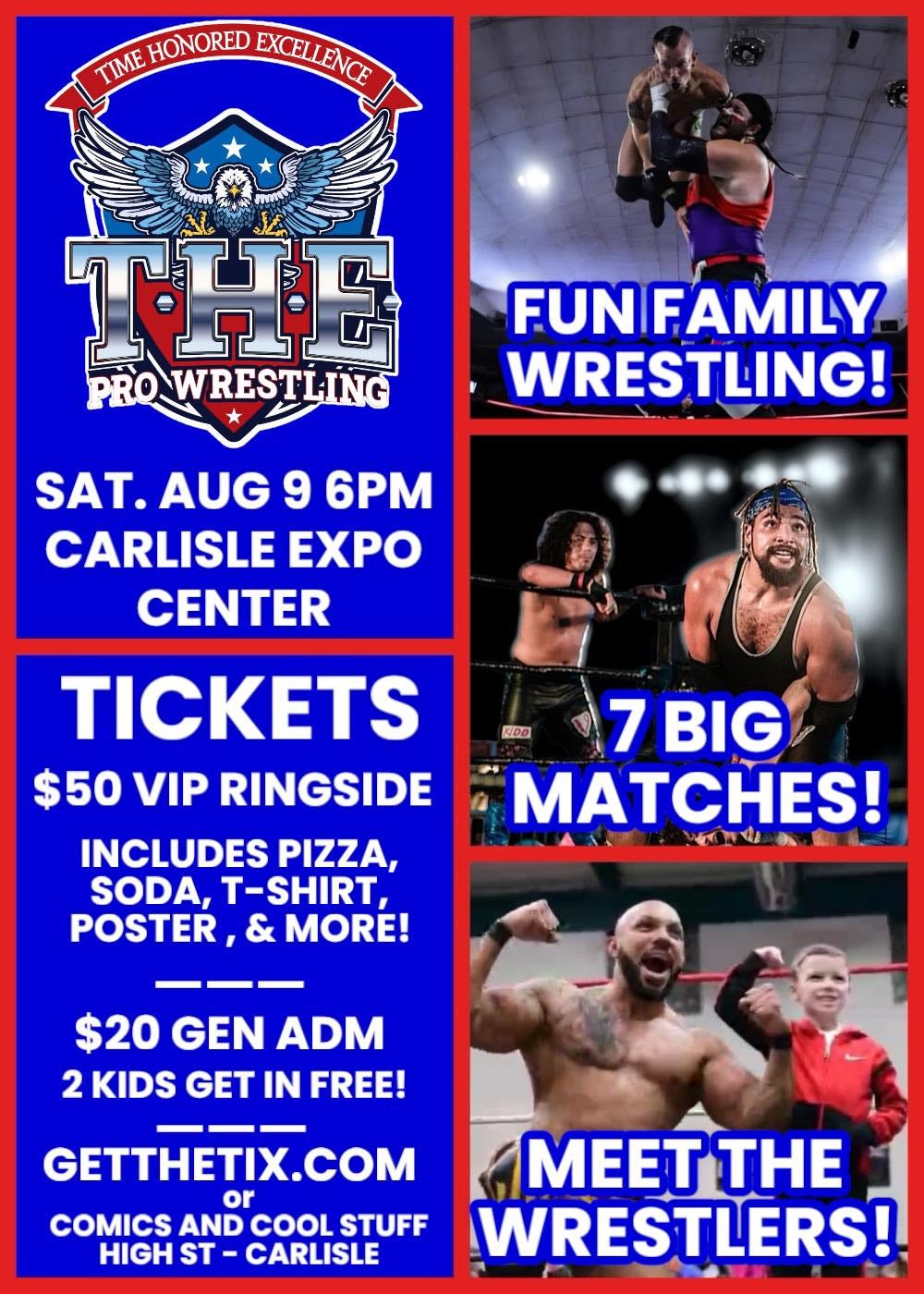 Time Honored Excellence Pro Wrestling debuts in Carlisle, Pennsylvania, on Saturday, August 9, 2025, at 6 p.m. at the Carlisle Expo Center (100 K Street, Carlisle, PA). Tickets are available online.