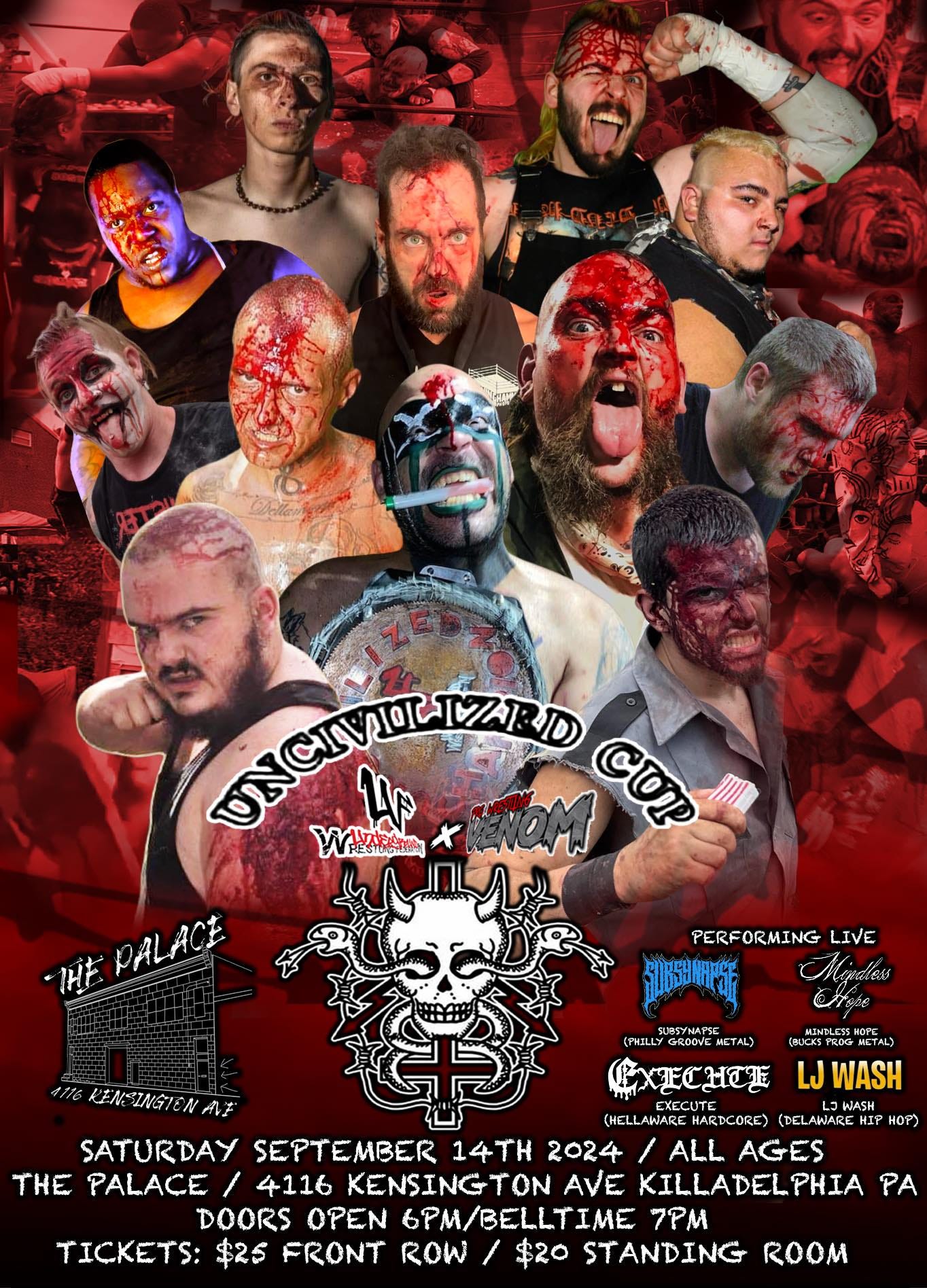 On Saturday, September 14, the Underground Wrestling Federation will face Pro Wrestling Venom in the Uncivilized Cup Deathmatch Tournament at The Palace, located at 4116 Kensington Avenue in Philadelphia, PA. Doors will open at 6 pm, with the bell time set for 7 pm.
