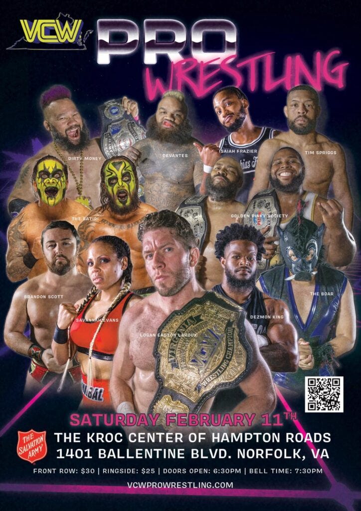 This Saturday, February 11, VCW presents live pro wrestling at The Kroc Center of Hampton Roads at 1401 Ballentine Boulevard in Norfolk, VA. Doors open at 6:30 p.m. with bell time at 7:30. Tickets are available online.
