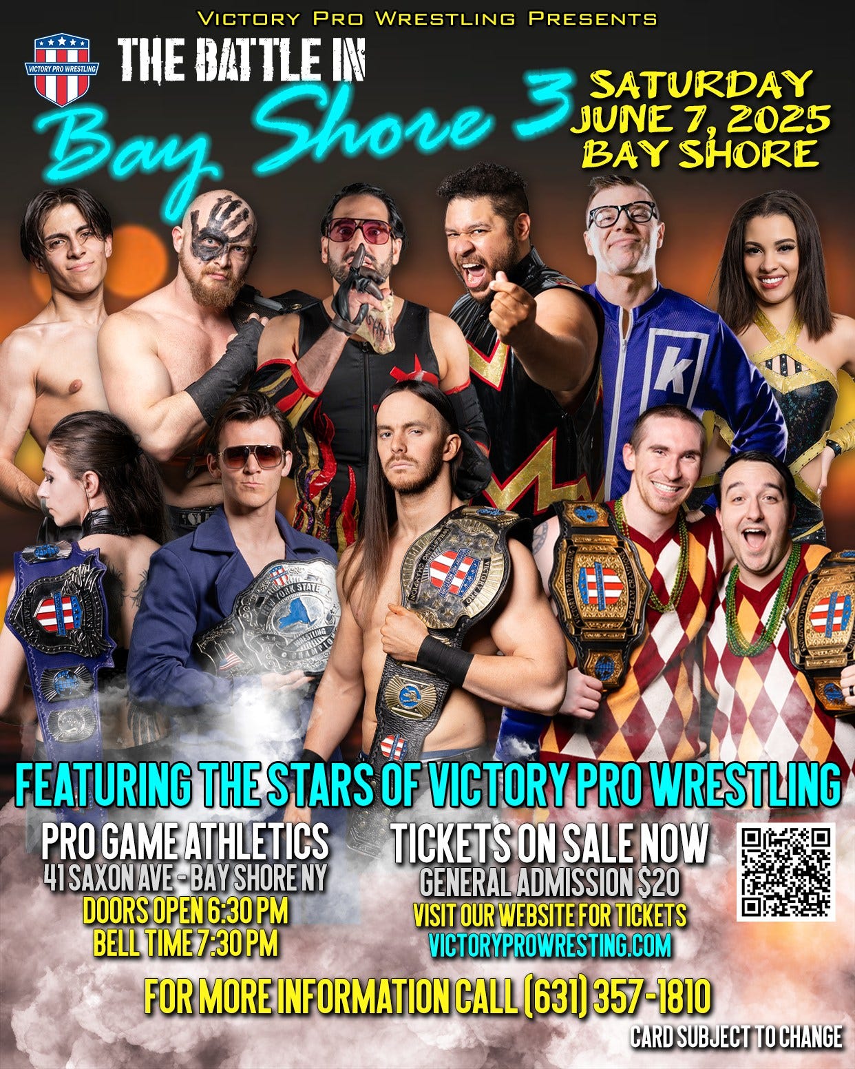 Victory Pro Wrestling will present The Battle in Bay Shore 3 at Pro Game Athletics, 41 Saxon Avenue, Bay Shore, NY, on Saturday, June 7. Doors open at 6:30 PM, with bell time scheduled for 7:30 PM. Tickets are available online.
