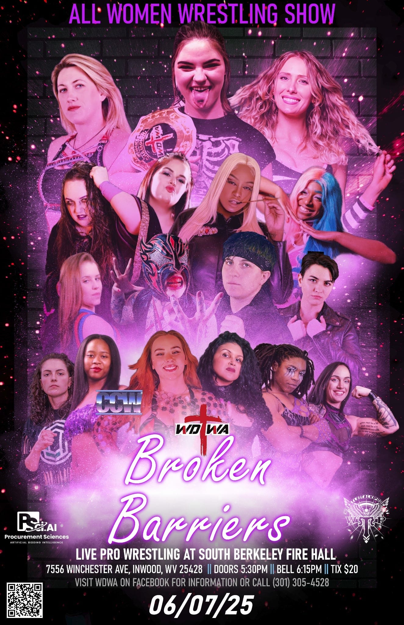 WDWA presents Broken Barriers, an all-women’s wrestling showcase, on Saturday, June 7 at the South Berkeley Fire Hall, located at 7556 Winchester Avenue, Inwood, West Virginia. Doors open at 5:30 p.m. and bell time is scheduled for 6:15 p.m. Tickets are $20 and will be available at the door or by phone at (301) 305-4528.