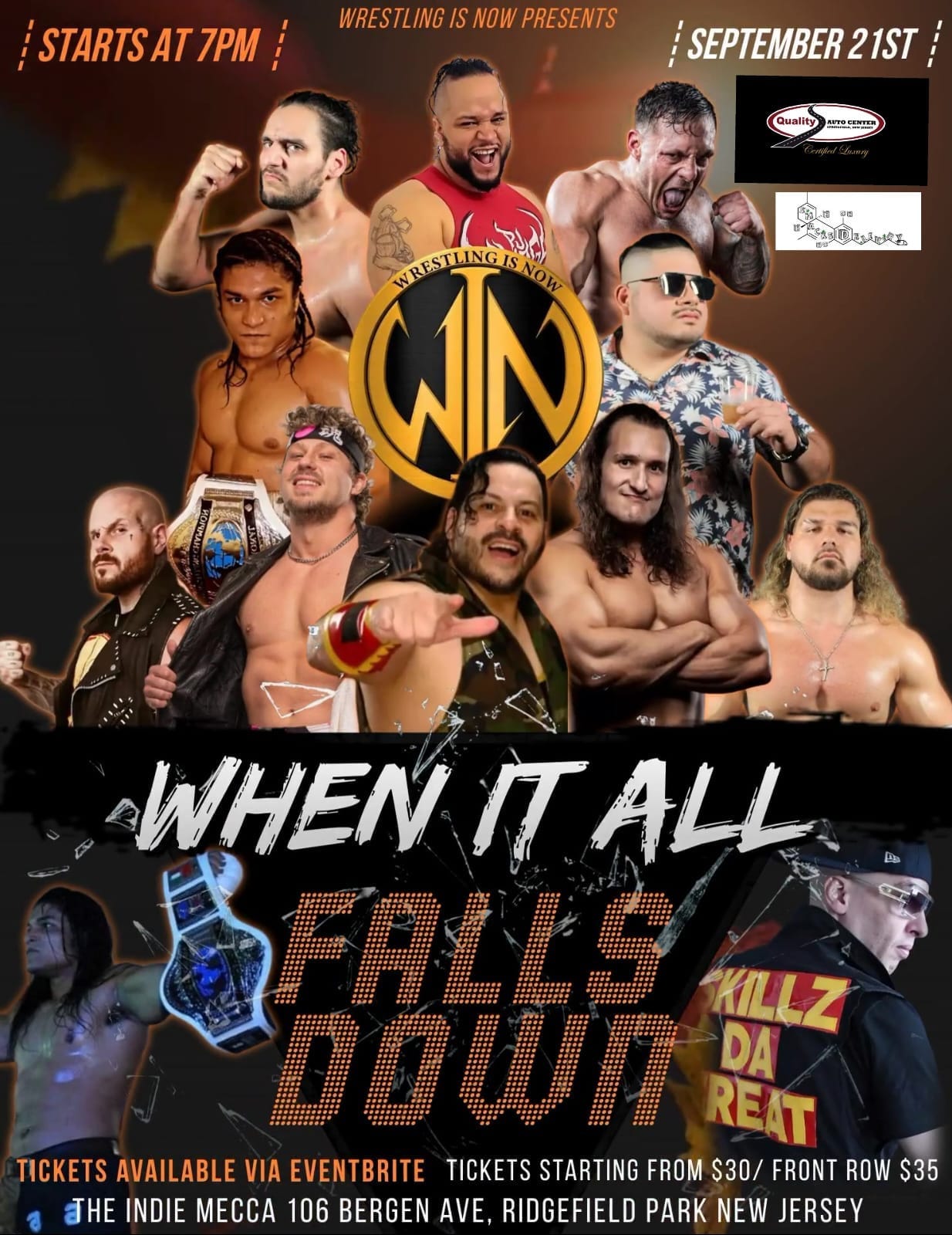 Wrestling Is Now presents When It All Falls Down on September 21st at 106 Bergen Ave in Ridgefield Park, NJ. Doors will open at 7 PM, and the show will begin at 8 PM. Tickets are available online.