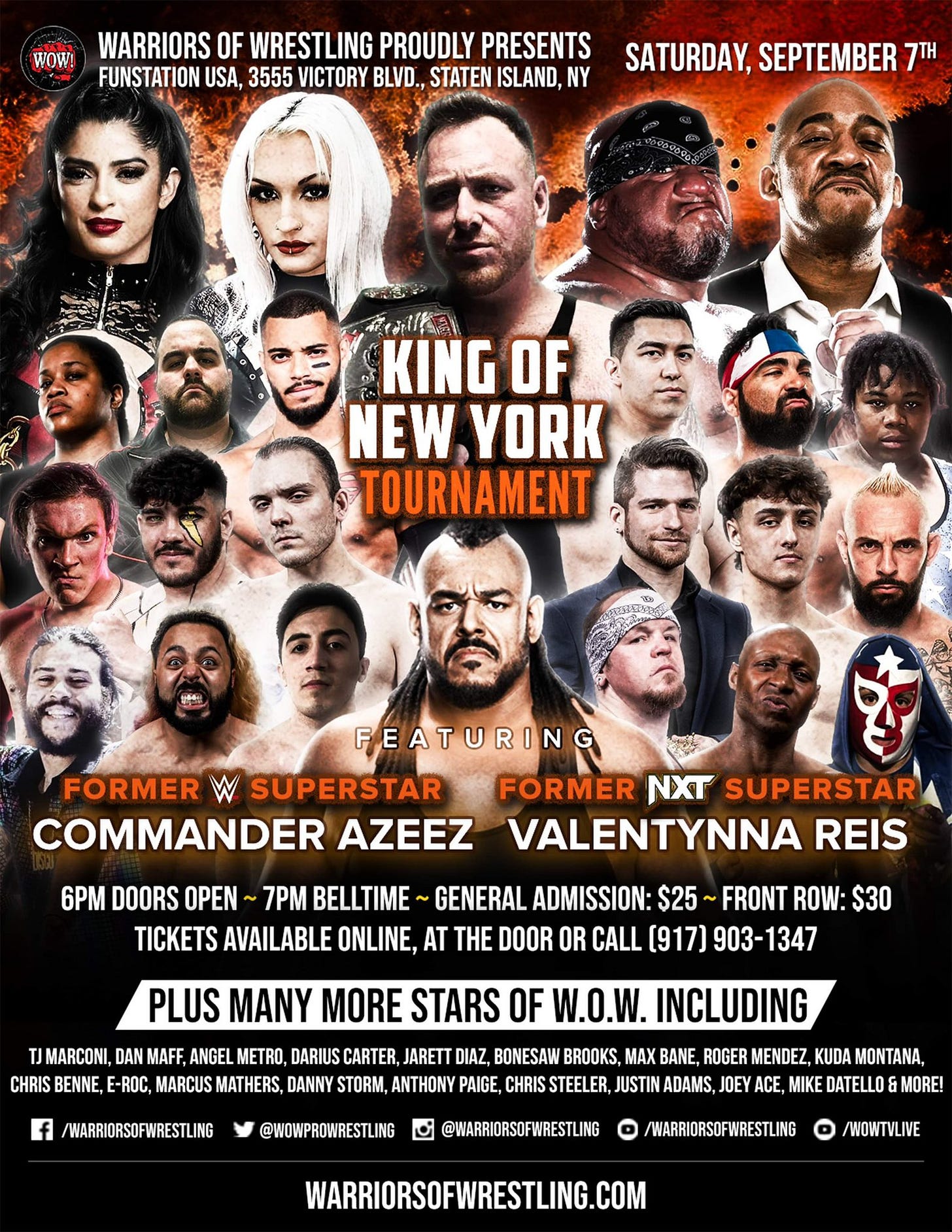 On September 7th, 2024, Warriors of Wrestling presents King of New York at Fun Station USA, located at 3555 Victory Boulevard, Staten Island, New York. The event features doors opening at 6 p.m. and bell time at 7 p.m. Tickets are available online.