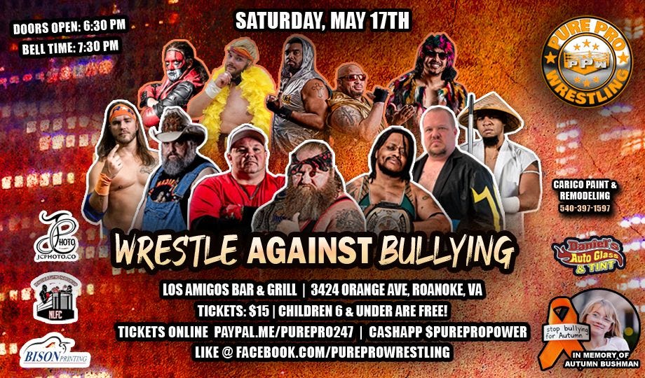 Pure Pro Wrestling will present Wrestle Against Bullying on Saturday, May 17, 2025, at Los Amigos Bar & Grill, 3424 Orange Avenue, Roanoke, Virginia. Doors open at 6:30 p.m. and bell time is scheduled for 7:30 p.m. Tickets are $15, and children 6 and under are free.