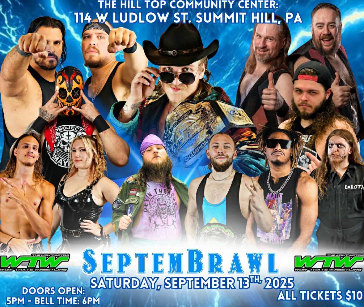 Wow Thats Wrestling will hold SeptemBrawl at the Hill Top Community Center, 114 W Ludlow St, Summit Hill, PA, on Saturday, September 13, 2025. Doors open at 5:00 p.m. and bell time is 6:00 p.m.