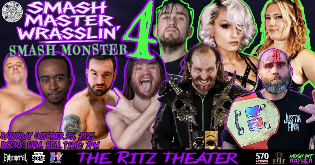 Smash Master Wrasslin’ presents Smash Monster 4 on Saturday, October 25, 2025, at The Ritz Theater, 222 Wyoming Avenue in Scranton, Pennsylvania. Doors open at 6 p.m., and bell time is 7 p.m. Tickets are available online.