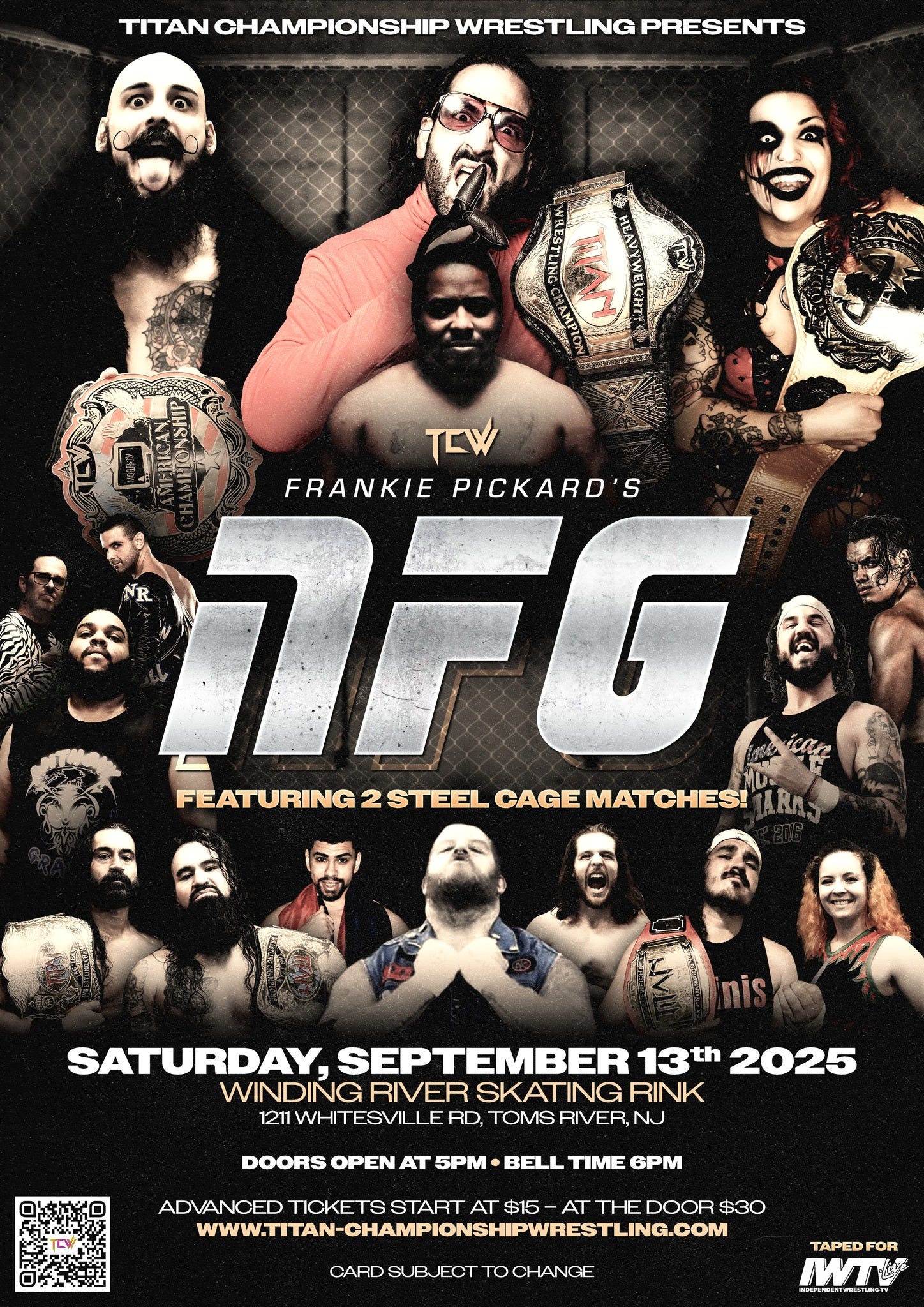 Titan Championship Wrestling will hold Frankie Pickard’s NFG at Winding River Skating Rink, 1211 Whitesville Rd, Toms River, NJ, on Saturday, September 13, 2025. Doors open at 5:00 p.m. and bell time is 6:00 p.m. Tickets are available online.