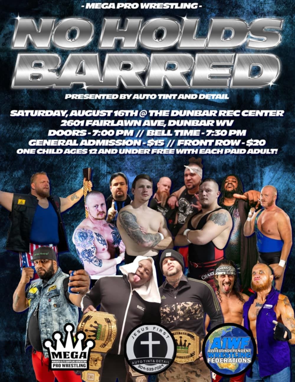 Monarch Elite Grappling Association (MEGA) will hold No Holds Barred at the Dunbar Rec Center, 2601 Fairlawn Ave, Dunbar, WV, on Saturday, August 16, 2025. Doors open at 7 p.m. and bell time is 7:30 p.m. One child age 12 and under is free with each paid adult. Tickets will be available at the door.