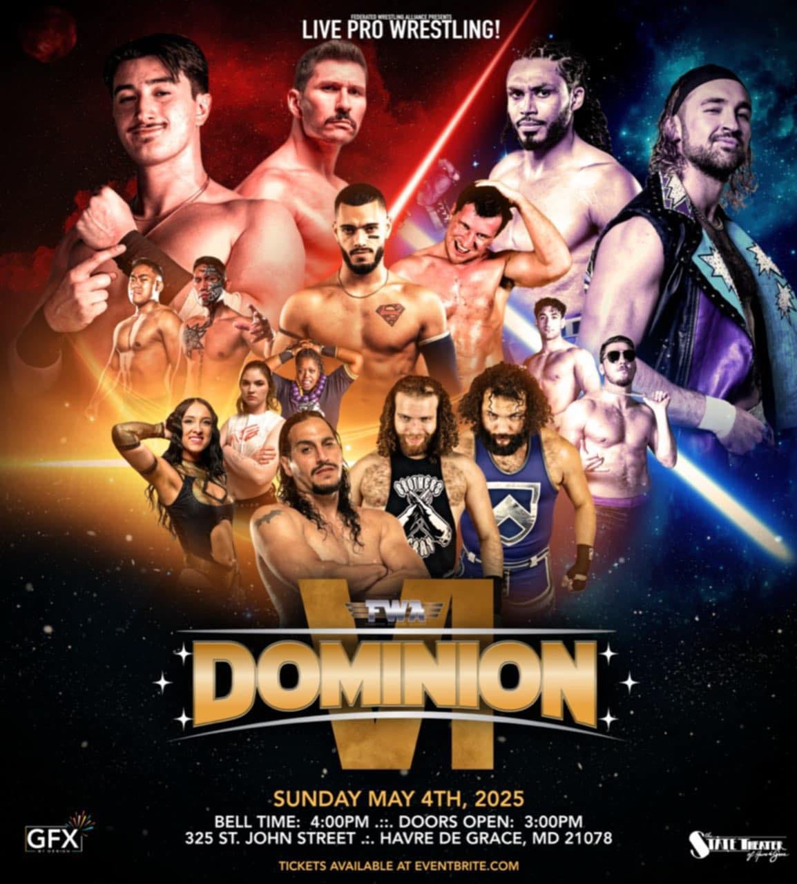 Federated Wrestling Alliance presents Dominion VI on Sunday, May 4, 2025, at the State Theater in Havre de Grace, Maryland, located at 325 St. John Street. Doors open at 3:00 p.m. and bell time is scheduled for 4:00 p.m. Tickets are available online.