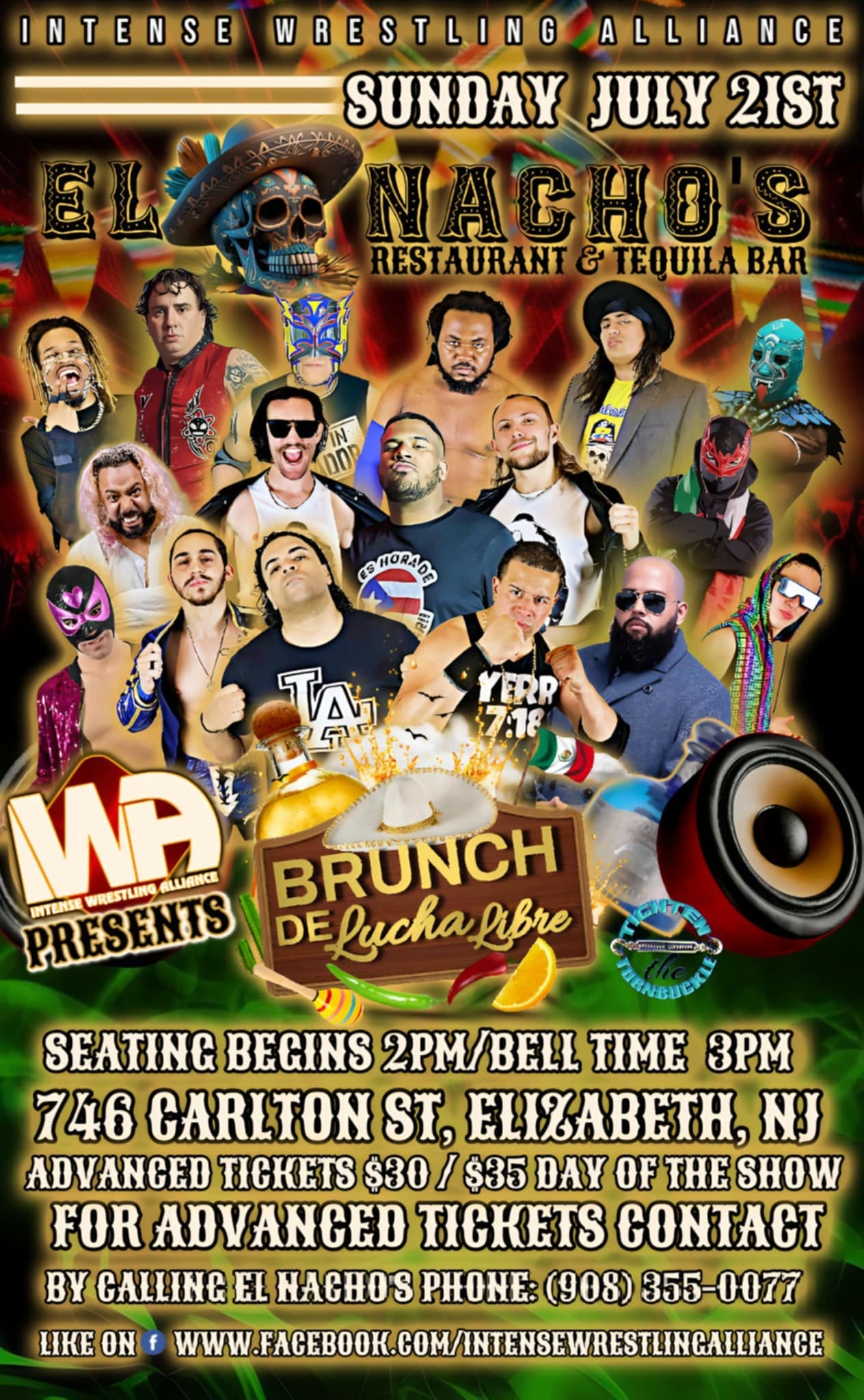 This Sunday, July 21st, Nachos Restaurant and Tequila Bar at 746 Carlton St, Elizabeth, New Jersey presents Brunch de Lucha Libre. Bell time is at 3:00 p.m. To buy tickets, call Nachos Restaurant at (909) 360-1704.