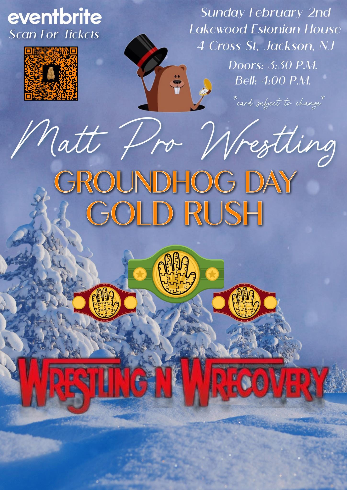 Matt Pro Wrestling presents Groundhog Day Gold Rush on Sunday, February 2nd, at the Lakewood Estonian House, located at 4 Cross Street in Jackson, NJ. Doors open at 3:30 PM, with the bell time set for 4:00 PM. Tickets are available online.