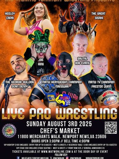 Mid-Atlantic Territory Wrestling heads to Newport News, Virginia, on Sunday, August 3, 2025, with a live pro wrestling event at Chef’s Market (11800 Merchants Walk, Newport News, VA 23606). Doors open at 3:00 p.m. and bell time is scheduled for 4:00 p.m. Tickets are available online.