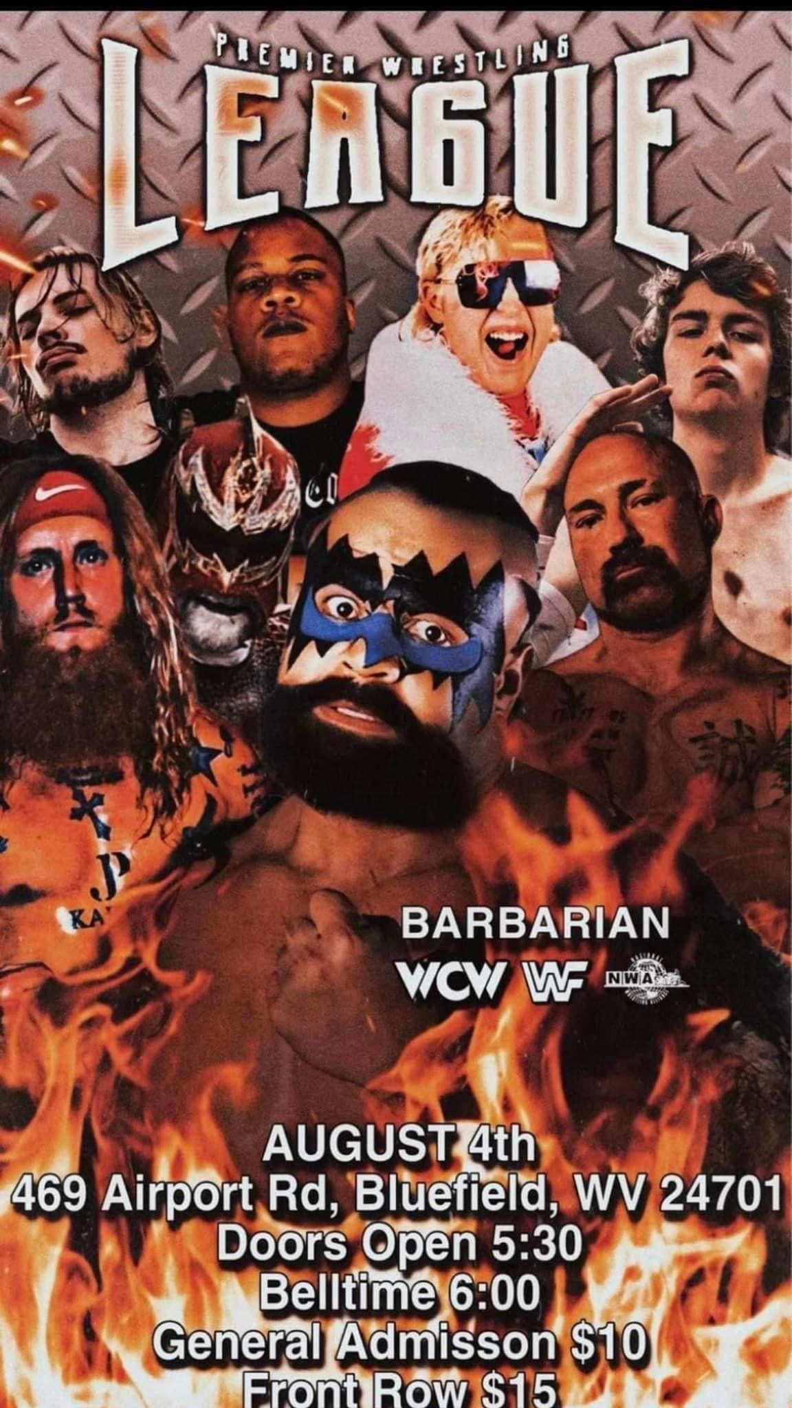 Premier Wrestling League presents Live Pro Wrestling on August 4 at 469 Airport Rd, Bluefield, WV 24701. Doors open at 5:30 PM, with bell time at 6:00 PM. General Admission is $10, and front-row seats are $15.