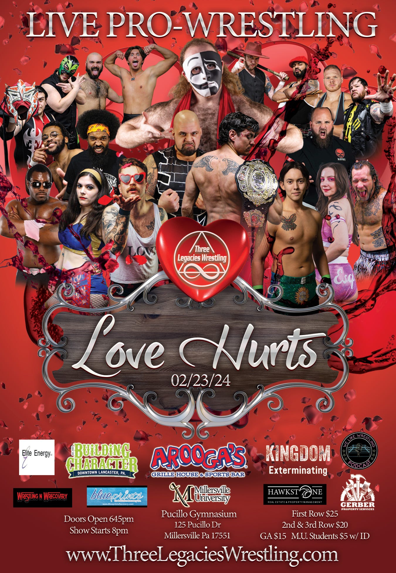 This Friday, February 23, Three Legacies Wrestling presents Love Hurts at Pucillo Gymnasium at Millersville University in Millersville, PA. Doors open at 6:45 p.m. and bell time is 8. Tickets are available online.