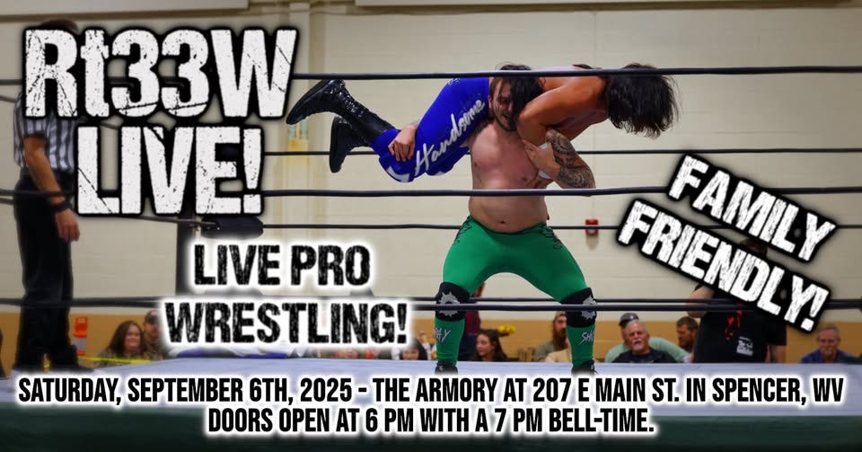 Route 33 Wrestling will hold an event at The Armory, 207 East Main St., in Spencer, WV, on Saturday, September 6, 2025. Doors open at 6 p.m. and the bell time is 7 p.m. Tickets are at the door.