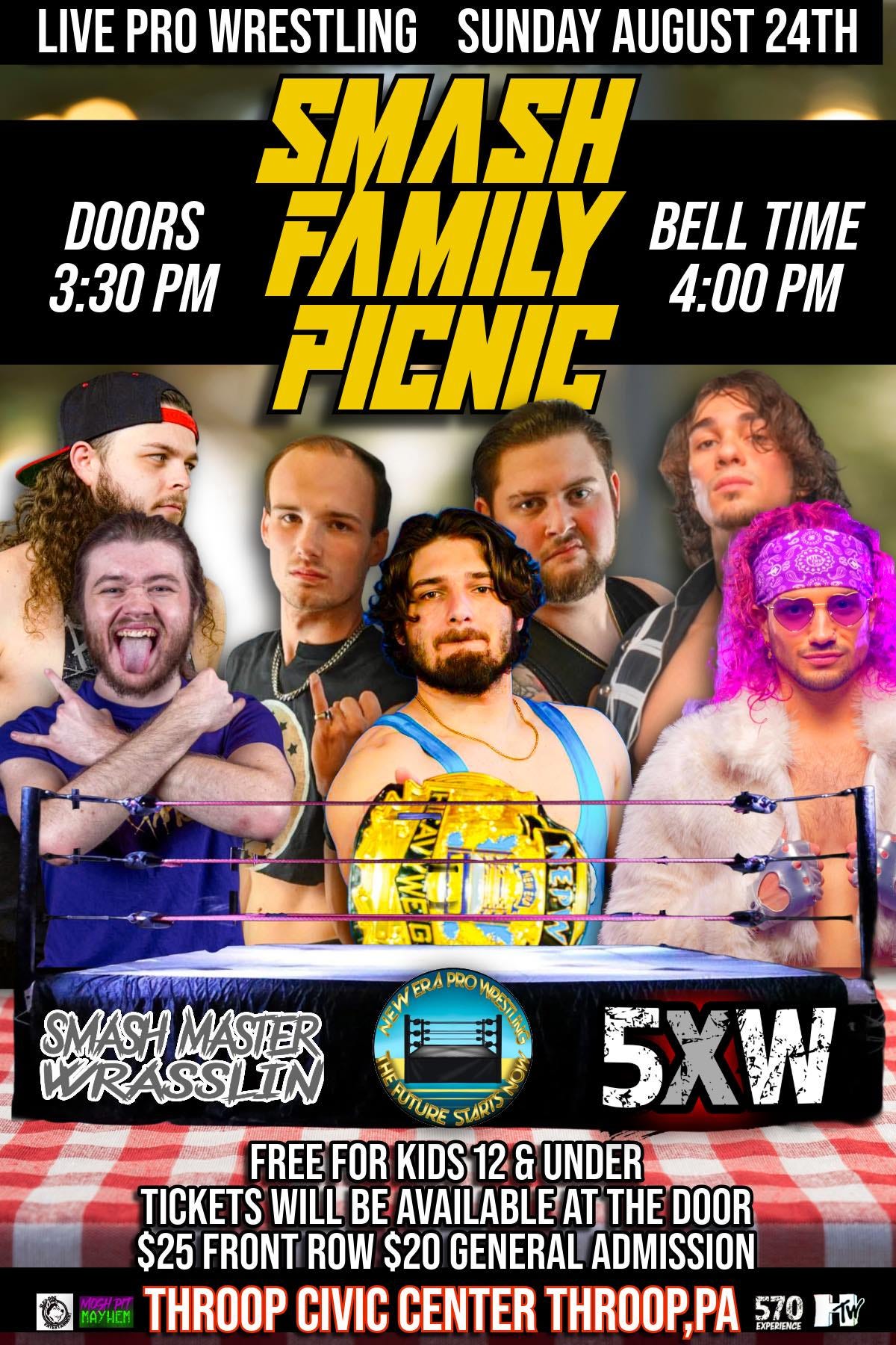 Smash Master Wrasslin will hold Smash Family Picnic at the Throop Civic Center in Throop, Pennsylvania, on Sunday, August 24, 2025. The start time is 4 p.m. Tickets will be available at the door.
