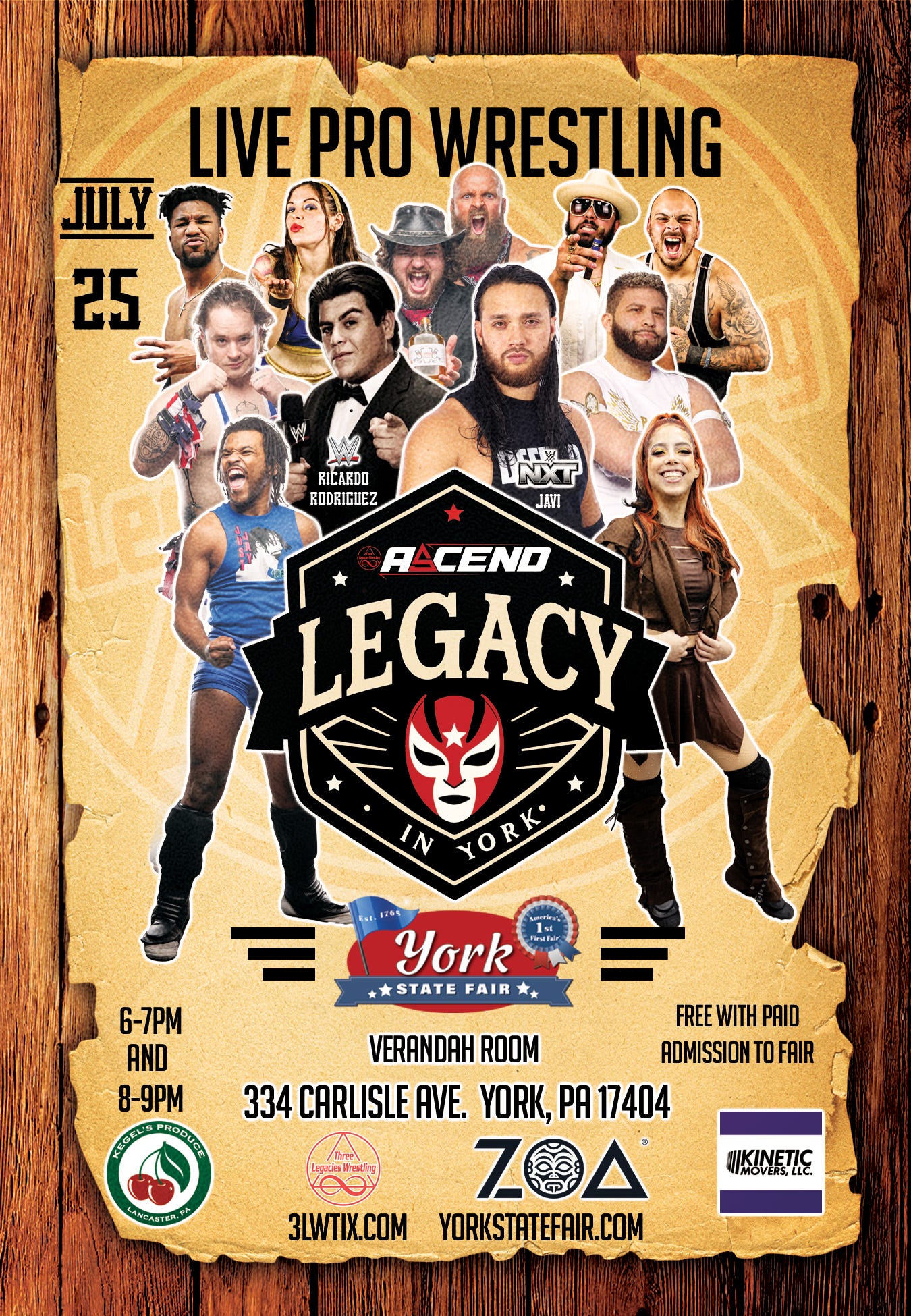 Three Legacies Wrestling presents Legacy in York on Friday, July 25, 2025, at the Verandah Room at the York State Fair (334 Carlisle Ave., York, PA 17404). Bell times are scheduled for 6:00 p.m. and 8:00 p.m., and admission to the event is free with paid entry to the fair. Tickets and fair information are available online.