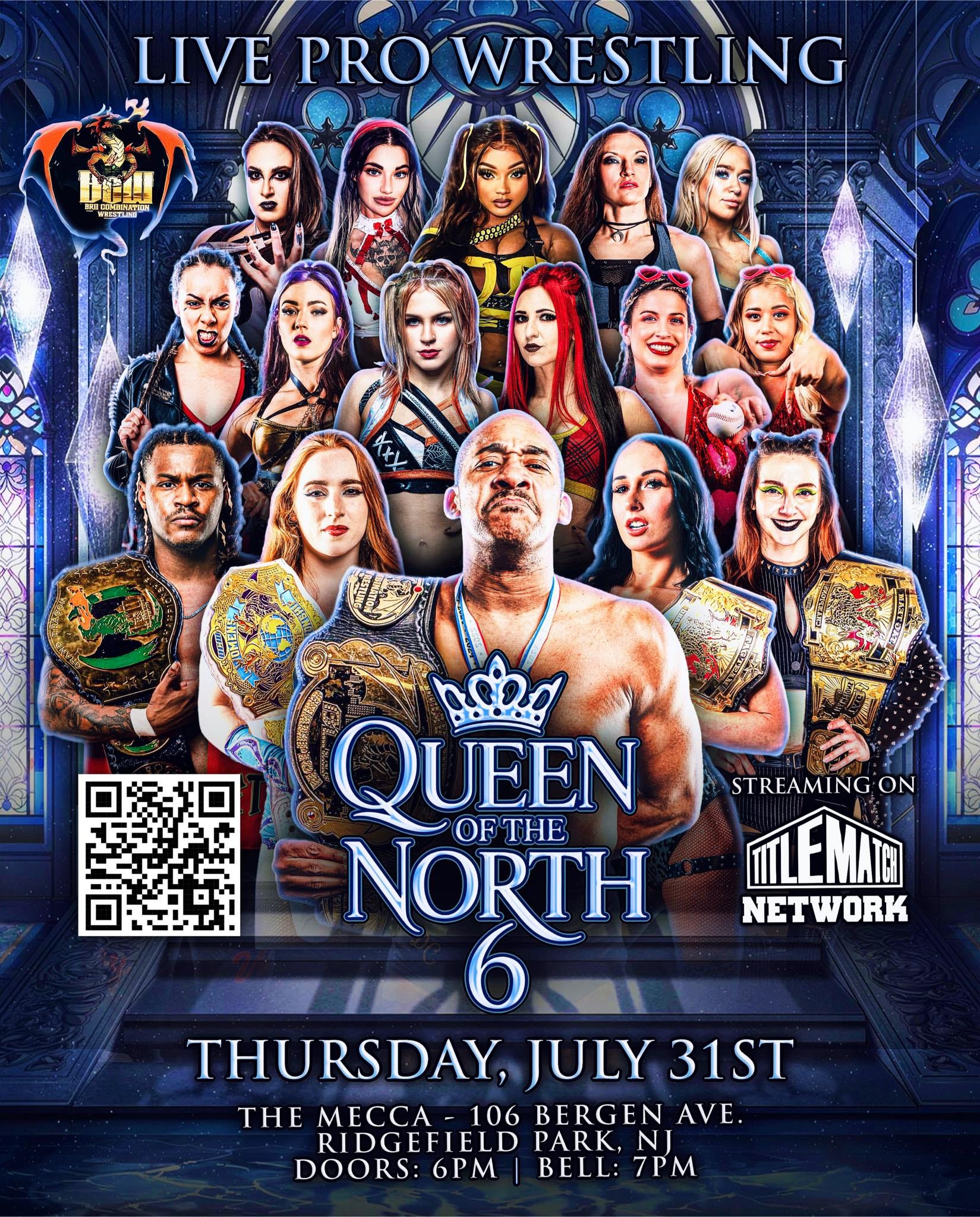 Brii Combination Wrestling presents Queen of the North 6 on Thursday, July 31, 2025, at The Mecca (106 Bergen Avenue, Ridgefield Park, NJ 07660). Doors open at 6:00 p.m. and bell time is scheduled for 7:00 p.m. Tickets are available online.