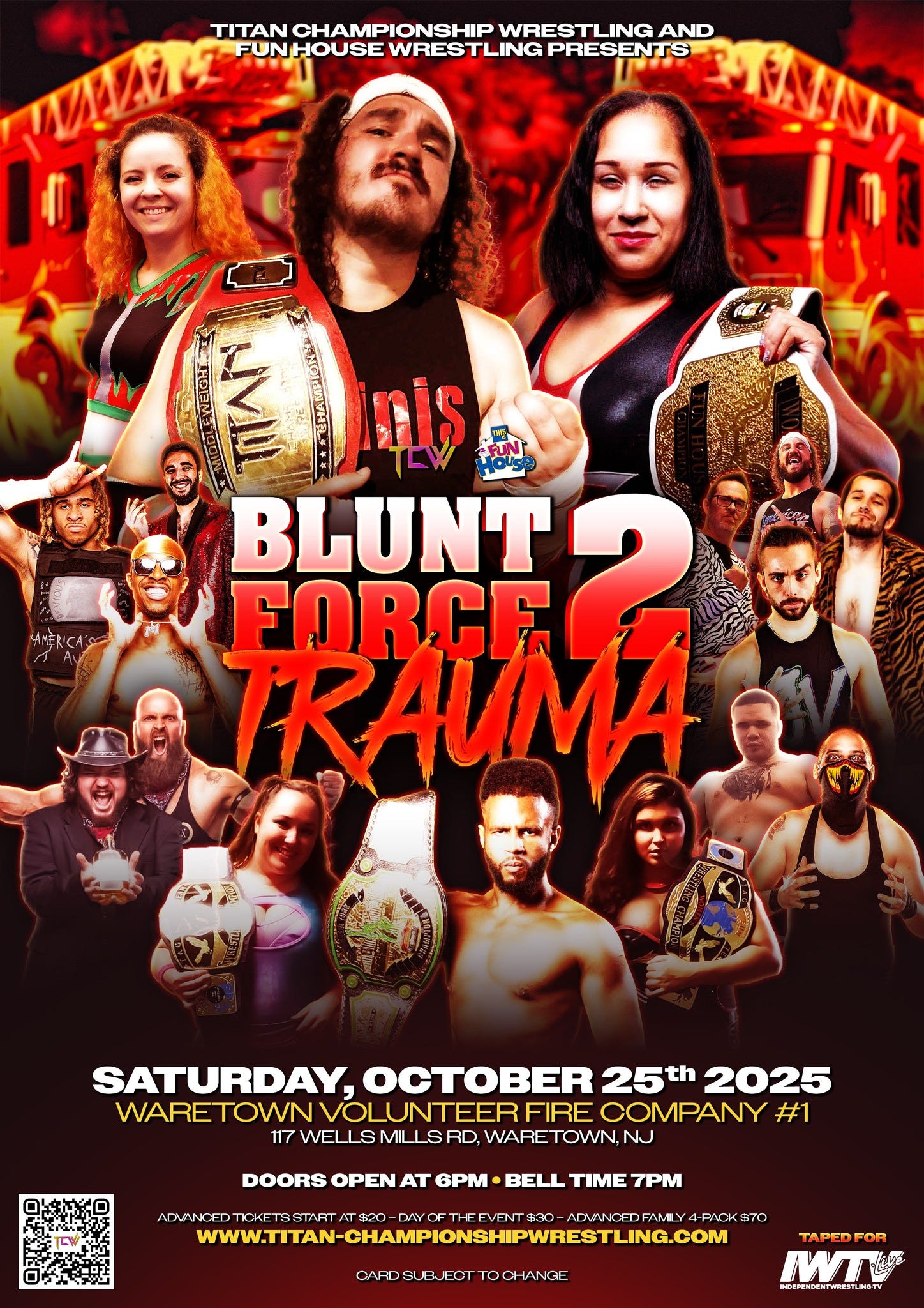 Titan Championship Wrestling Entertainment and Funhouse Wrestling present Blunt Force Trauma 2 on Saturday, October 25, 2025, at the Waretown Volunteer Fire Company #1, 117 Wells Mills Road in Waretown, New Jersey. Doors open at 6 p.m., and bell time is set for 7 p.m. Tickets are available online.