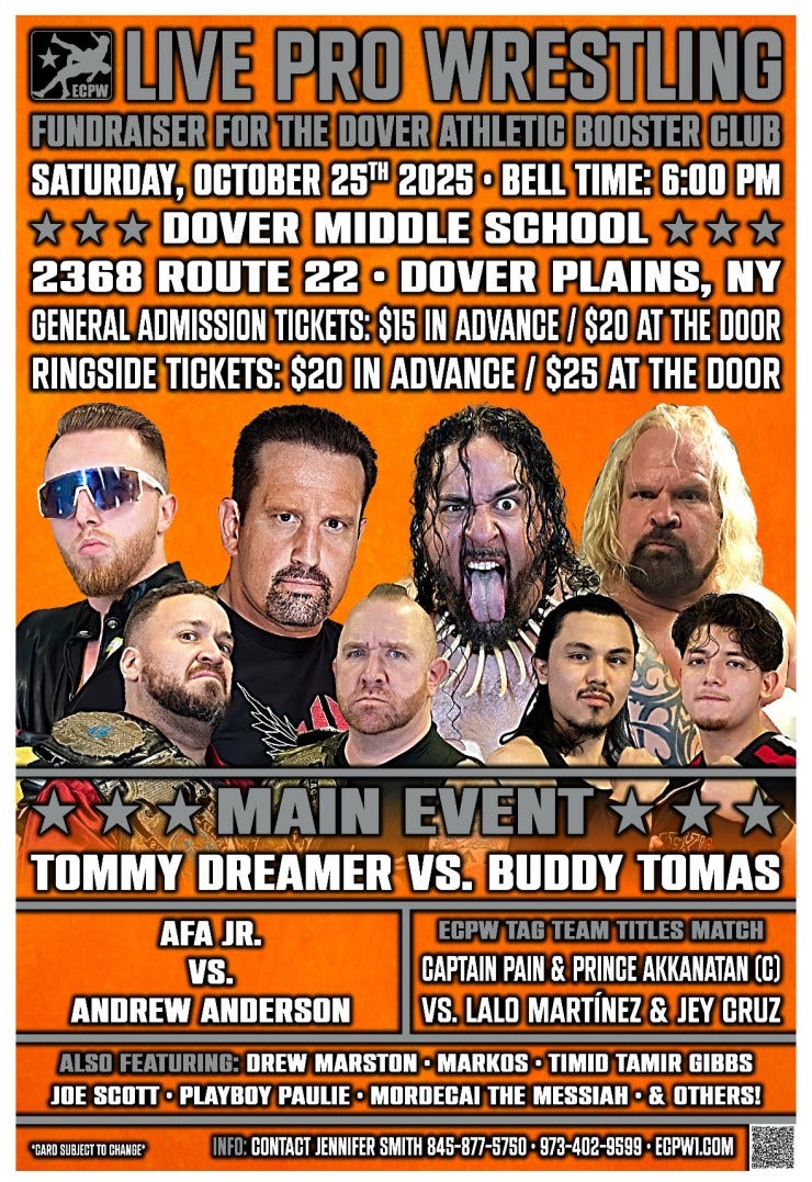 East Coast Professional Wrestling (ECPW) presents a live event on Saturday, October 25, 2025, at Dover Middle School, 2368 Route 22 in Dover Plains, New York. The bell time is 6 p.m. Tickets are available online.