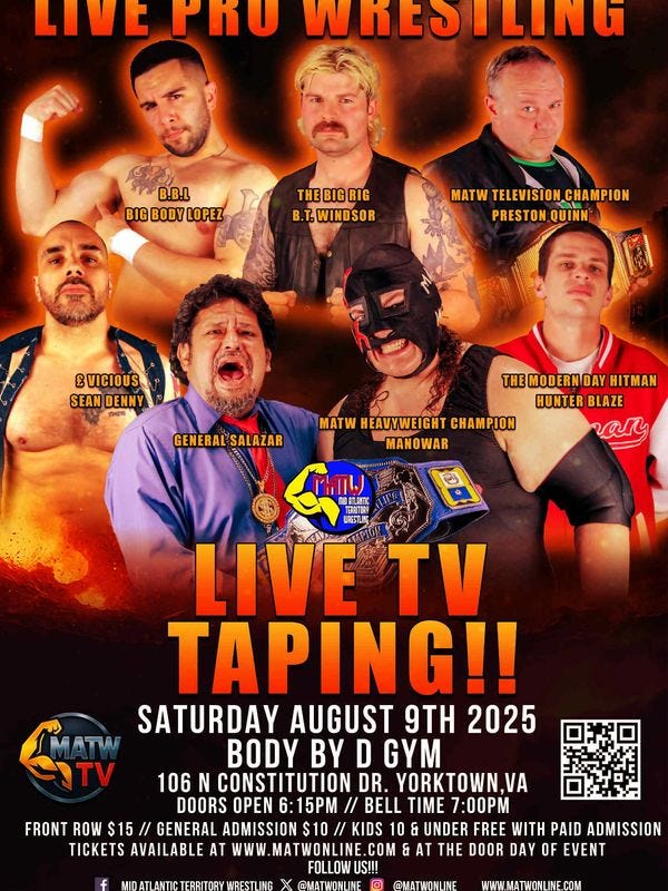 Mid-Atlantic Territory Wrestling returns to Yorktown, Virginia, on Saturday, August 9, 2025, with a live TV taping at Body By D Gym (106 N Constitution Dr, Yorktown, VA 23692). Bell time is scheduled for 7:00 p.m. Tickets are available online.