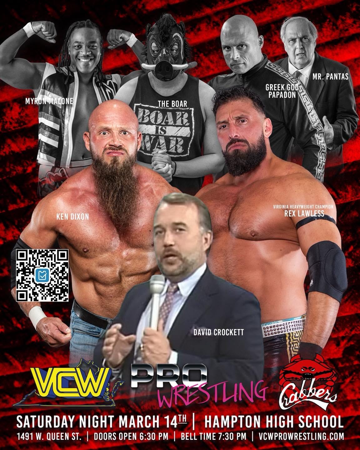 VCW Pro Wrestling will return to Hampton High School, 1491 W Queen St, in Hampton, Virginia on Saturday, March 14, 2026. The doors open at 6:30 p.m. and the bell time is 7:30 p.m. Tickets are available online.