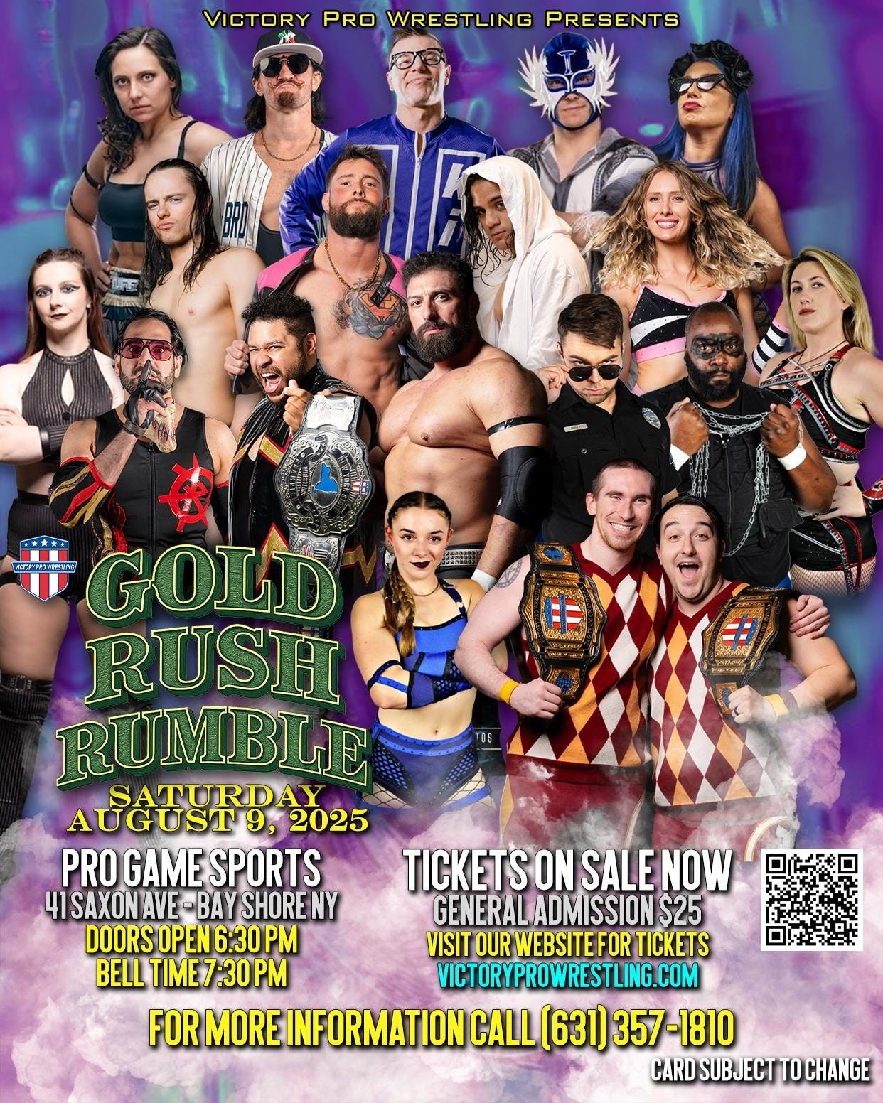 Victory Pro Wrestling returns to Bay Shore, New York, on Saturday, August 9, 2025, with Gold Rush Rumble at Pro Game Sports (41 Saxon Avenue, Bay Shore, NY). Tickets are available online.