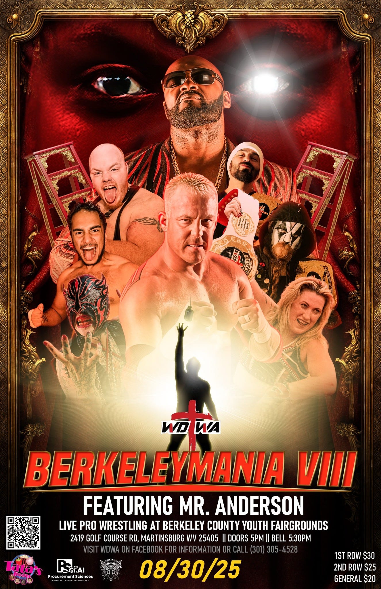 WDWA presents BerkeleyMania VIII at Berkeley County Youth Fairgrounds, 2419 Golf Course Rd in Martinsburg, WV, on Saturday, August 30, 2025. Doors open at 5:00 p.m. and bell time is 5:30 p.m. For ticket information, call (301) 305-4528.