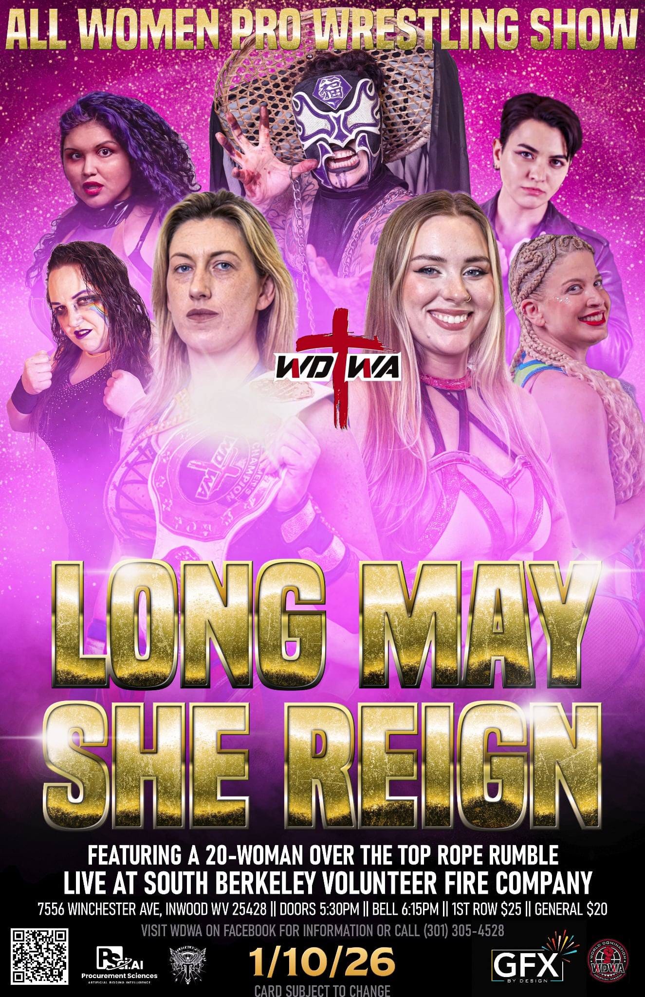 World Domination Wrestling Alliance (WDWA) presented Long May She Reign on Saturday, January 10, 2025, Inwood, West Virginia. Results are below.